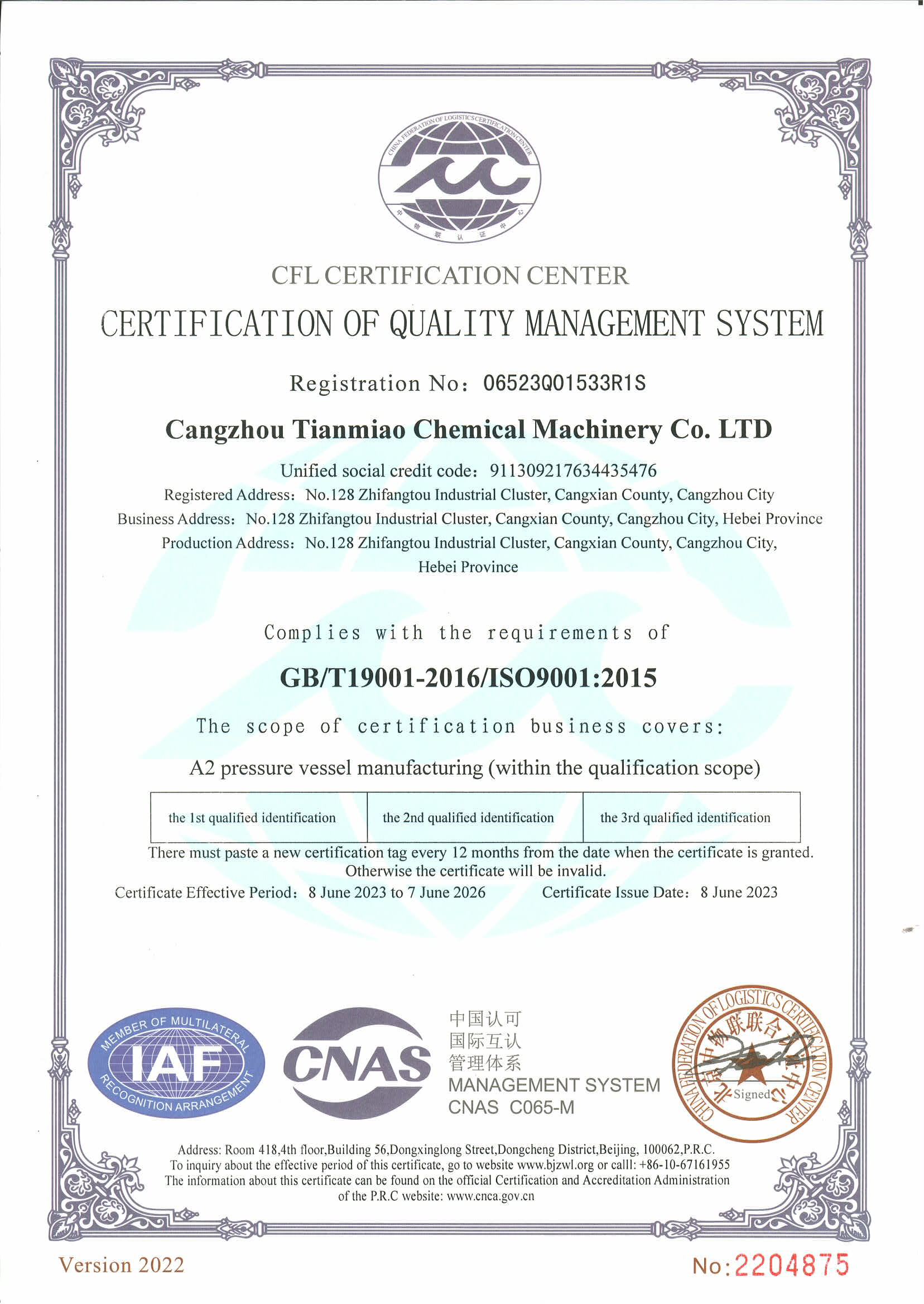Cangzhou Tianmiao Chemical Machinery Co., Ltd., a subsidiary of China National Chemical Machinery Group, optimizes and integrates its resources following the reorganization. The company is a leading pressure vessel design and manufacturing company and a member of the China Chemical Equipment Association.